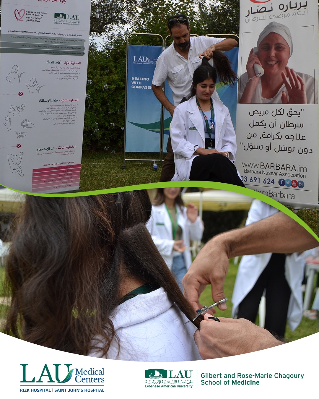 Senior nursing students Lynne Ghannam and Lyllaf Youssef donated their hair through the Barbara Nassar Association during the Roumieh Health Day, marking the LAU Mobile Clinic’s 401st stop. A beautiful act of compassion and strength.